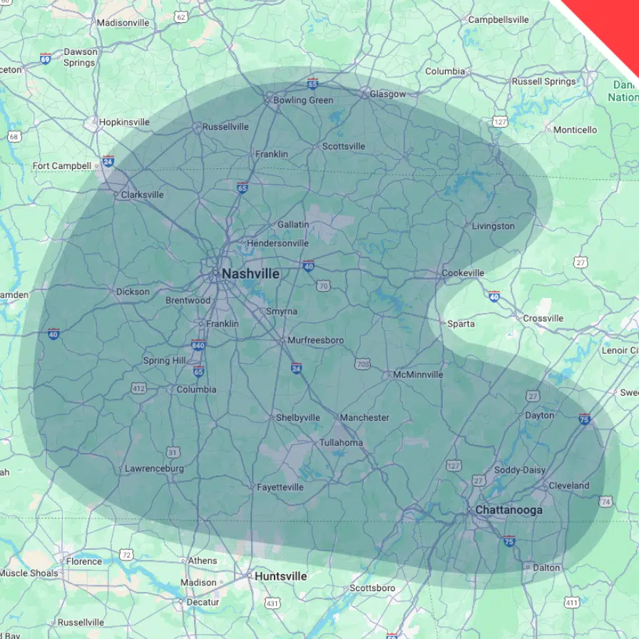 We serve the area up to the Kentucky border, down to Alabama, east to Crossville, and west to Memphis. This includes the following cities: